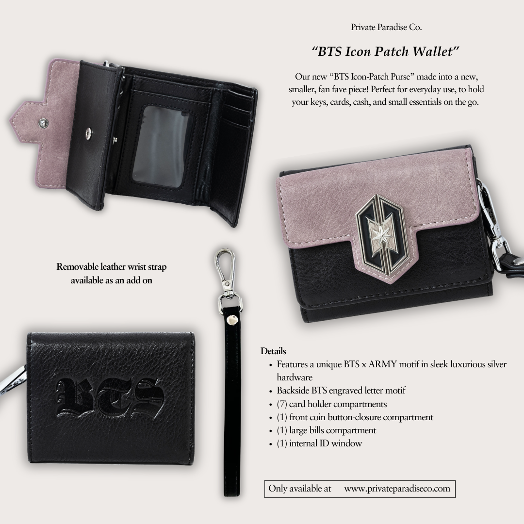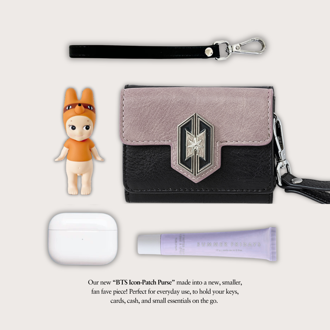 Our new “BTS Icon-Patch Purse” made into a new, smaller, fan fave piece! Perfect for everyday use, to hold your keys, cards, cash, and small essentials on the go.